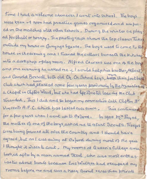 Alfred Chivers was one of the boys and one evening he asked me if I would help his brother Albert, and Arnold Boxwell, both old Christ Church School boys, run their football club which had been started some few years previously by the Minister of a Chapel in Clifton Wood, but who had left Bristol leaving the club stranded. This I did and so began my connection with Clifton St. Vincent’s A.F.C. which has lasted ever since. This continued for a few years when I went up to Oxford.