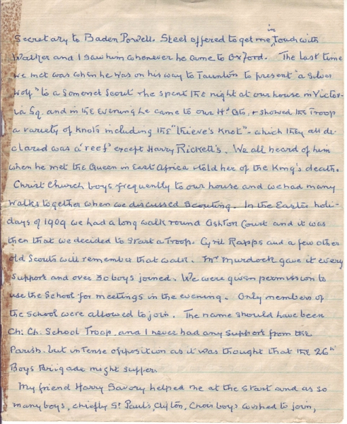 1n 1908 Mrs Payne, the mother of one of the boys, asked me to start Scouts. Troops were being formed all over the country and I should have agreed, but as I was away at Oxford during most of the year I thought it wiser to wait. My rooms at Queens College were looked after by a man named Steel, who was most enthusiastic about Scouts, because Eric Walker had occupied my rooms before me and was a keen scout and was then private secretary to Baden Powell.